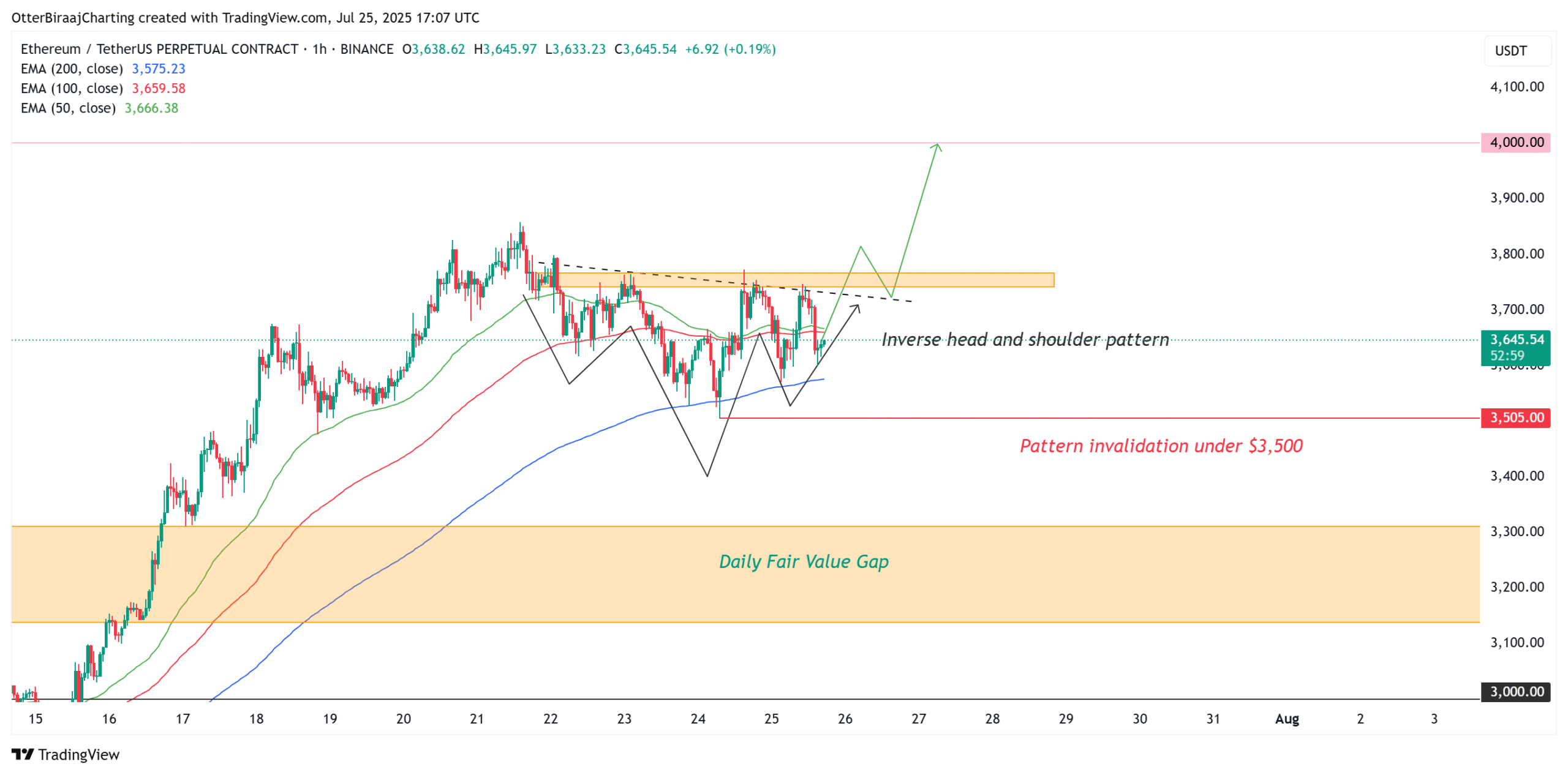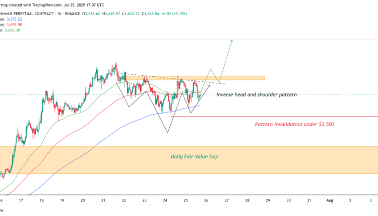 A potential inverse head-and-shoulders pattern is forming on the one-hour chart. A confirmed breakout above $3,750, a key resistance and descending trendline, could send the price to $4,000.
