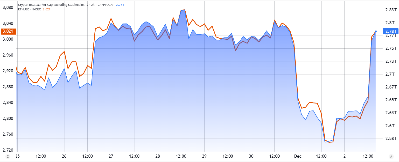 Ether (ETH) gained 8% on Tuesday but stalled near $3,000 as derivatives markets signaled doubt about further upside. The move tracked the broader cryptocurrency rally as traders priced in better odds of new economic stimulus, especially after stress in Japan’s government-bond market on Monday.