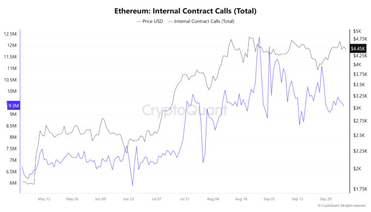 Data from CryptoQuant shows Ethereum’s Internal Contract Calls, a metric tracking complex network interactions such as DeFi and real-world asset (RWA) tokenization, has undergone a structural shift since mid-July. The daily average has climbed to over 9.5 million from 7 million, signaling a durable increase in ecosystem depth rather than a short-term speculative rise.
