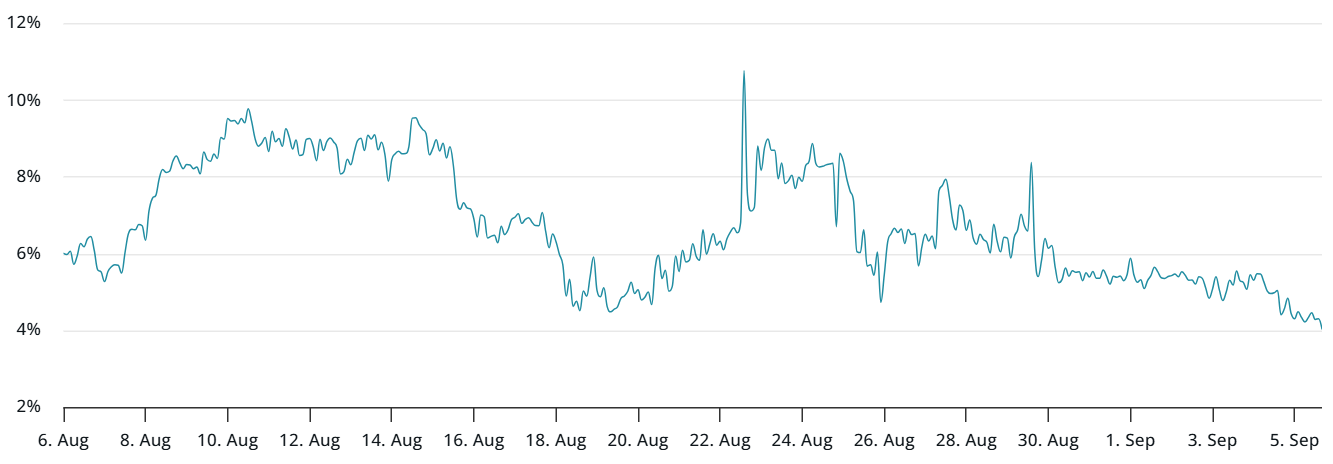Currently at 4%, ETH’s options delta skew shows no sign of elevated fear, consistent with the past week. Interestingly, demand for call (buy) options did not rise even when ETH reached its all-time high on Aug. 24. This suggests professional traders remain cautious, reluctant to flip bullish despite a 48% rally over three weeks.