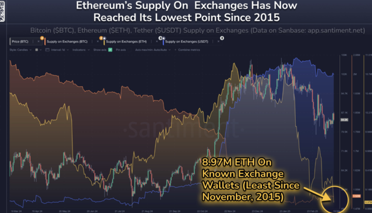 “Ethereum’s holders have now brought the available supply on exchanges down to 8.97M, the lowest amount in nearly 10 years (November, 2015),” crypto analytics platform Santiment said in a March 20 X post.