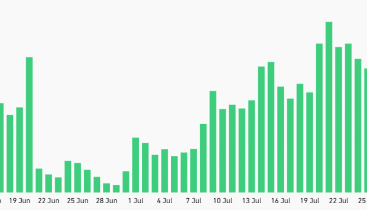 The ETH futures aggregate open interest rose to $60.8 billion, up from $47 billion a week earlier. However, the increase stems mainly from ETH’s price appreciation, as open interest in Ether terms remains 11% below the July 27 peak of 15.5 million ETH.