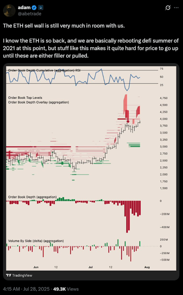 Ether (ETH) gained 57% over the past month, but consistent selling near $4,000 is putting a cap on the price upside. Independent market analyst Adam pointed to sell walls in the zone and said that even though “ETH is so back,” its price could lose momentum until these are either filled or pulled.”
