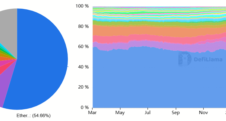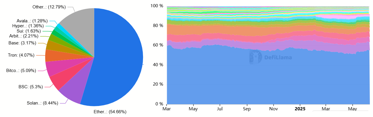 Despite Ether’s failure to reclaim its all-time high during the 2024–25 cycle, none of the so-called Ethereum killers have come close to matching its $66.6 billion in total value locked (TVL). Ethereum currently holds a dominant 61% share of the market, while the two largest competitors together account for only 14%.