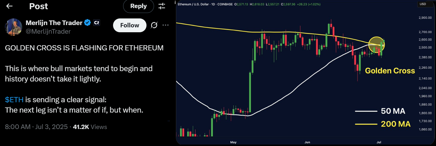 X user MerlijnTrader pointed out that the golden cross formation on Wednesday is “where bull markets tend to begin,” noting that technical analysis shows short-term momentum strengthening relative to the longer-term average. For MerlijnTrader, ETH is “sending a clear signal,” suggesting that the next bull run may be approaching.