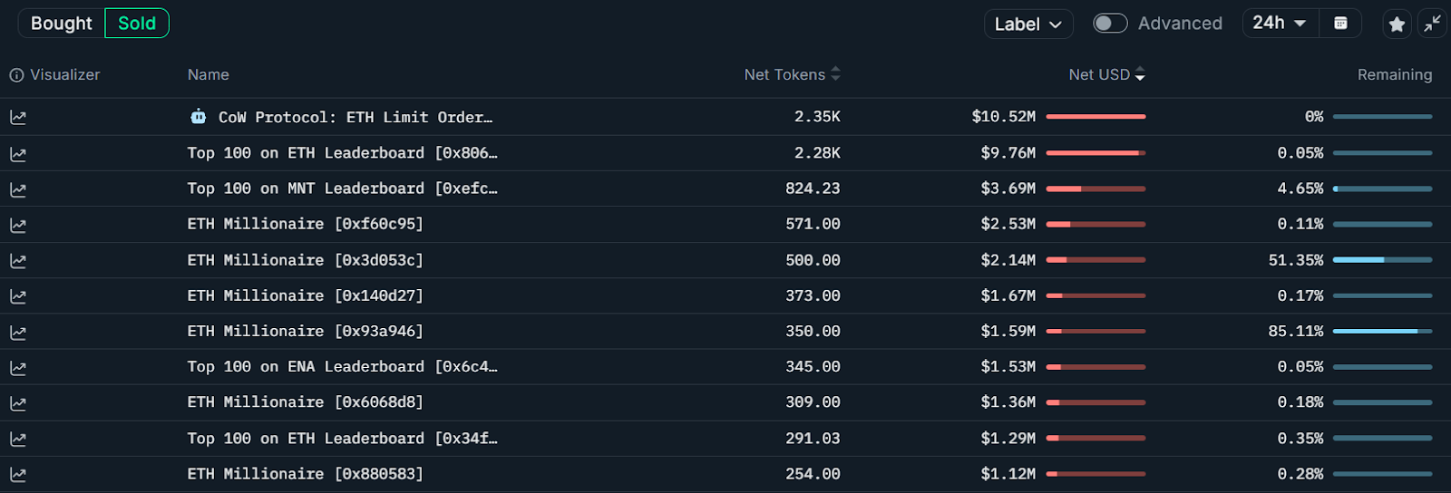 On Monday, the wallet labeled “0x806,” one of the top 100 Ether traders tracked by Nansen, sold over $9.7 million worth of Ether — the second-largest Ether sale during the past 24 hours — data from Nansen shows.