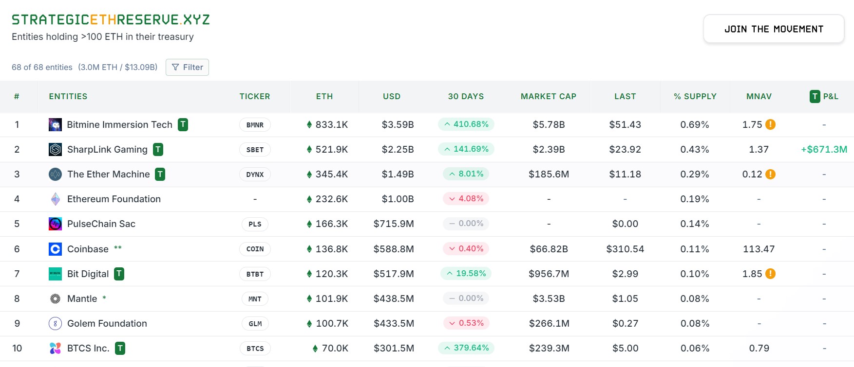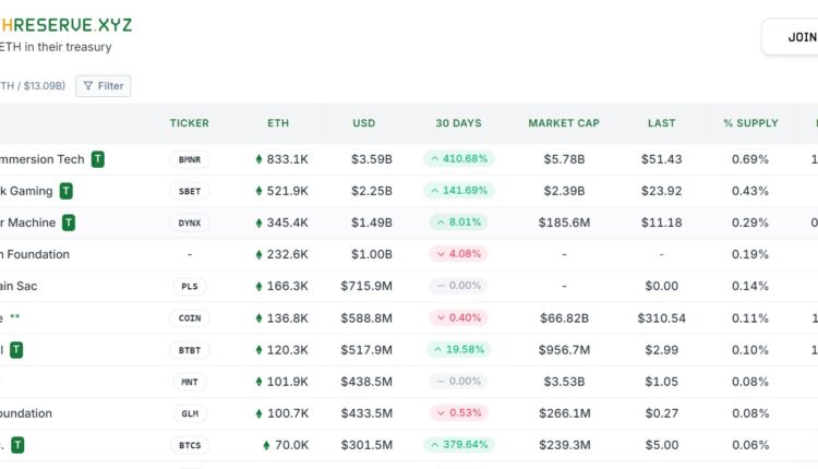 BitMine Immersion Technologies, which tops the list of ETH treasury holders, boosted its holdings to 833,100 ETH, a 410.68% jump in the amount of ETH it holds over the past 30 days.
