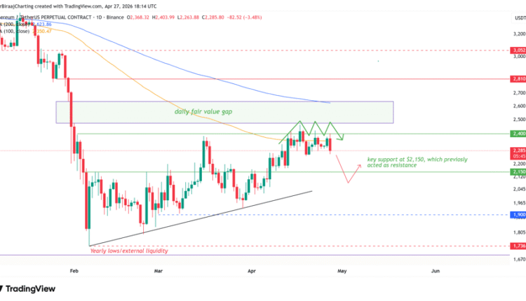 The support at $2,150 now carries more weight. The level previously acted as resistance and could be tested as a base in the coming days. A move below it opens the door to deeper downside levels.