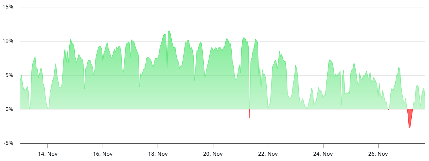 Demand for leveraged bullish ETH positions has been virtually absent since Monday, as indicated by the perpetual futures funding rate. Under normal conditions, this rate should sit between 6% and 12% to offset capital costs. Still, a meaningful portion of the current hesitation stems from uncertainty following the October flash crash.