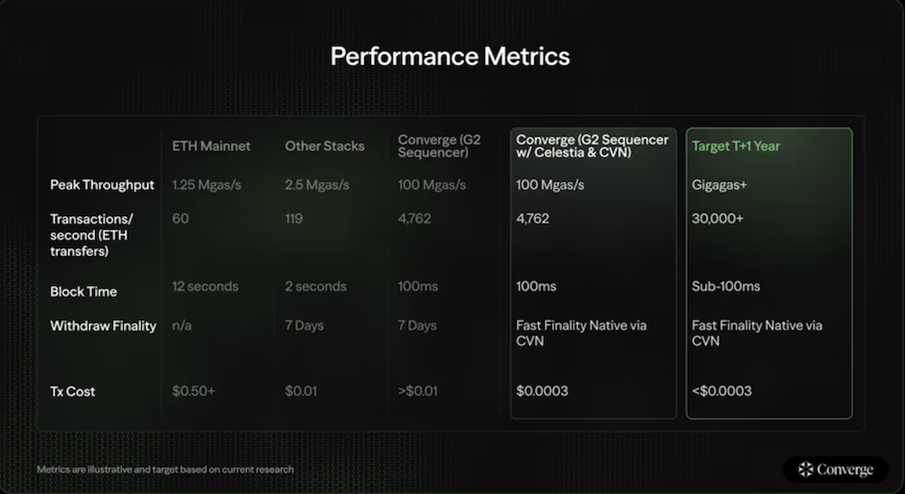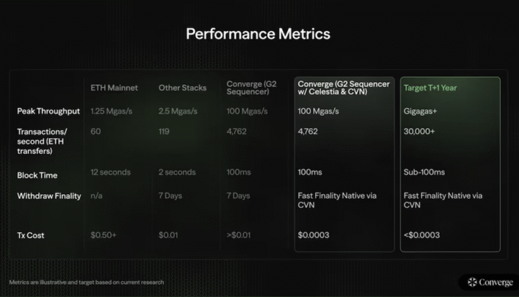 Converge will feature a 100 milliseconds (ms) native block time, with plans to reduce block times to 50ms by Q4 2025. The developers also plan to achieve at least one gigagas of potential throughput during 2025. Gigagas is a measure of billions of gas units processed by a blockchain network in one second.