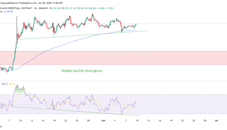 Ethereum’s native token, Ether (ETH), has consolidated between $2,300 and $2,800 for the past 30 days, but this sideways phase could be coming to an end. The 4-hour chart shows ETH retaining support from the 200-day exponential moving average (EMA), and the price is forming a hidden bullish divergence with the relative strength index (RSI). A hidden bullish divergence occurs when the price forms higher lows while indicators like RSI form a lower low, signaling a trend breakout.