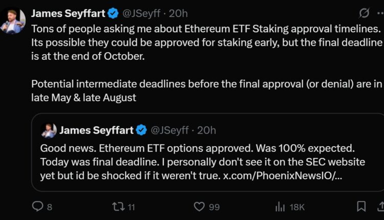 “It’s possible they could be approved for staking early, but the final deadline is at the end of October,” Seyffart said in a post on the X platform. “Potential intermediate deadlines before the final approval (or denial) are in late May & late August.”