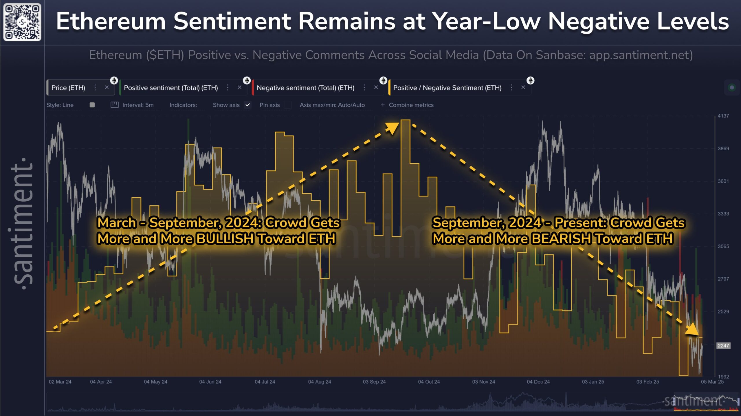 Santiment’s social sentiment tracker found that traders’ discussions about Ether on various social media channels like X, Reddit and Telegram are more bearish compared to other major cryptocurrencies, the blockchain data platform said in a March 5 X post.