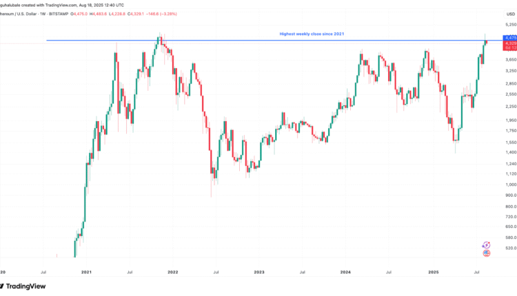 Ether (ETH) price hit another milestone this cycle after the ETH/USD trading pair achieved its highest weekly close since November 2021.