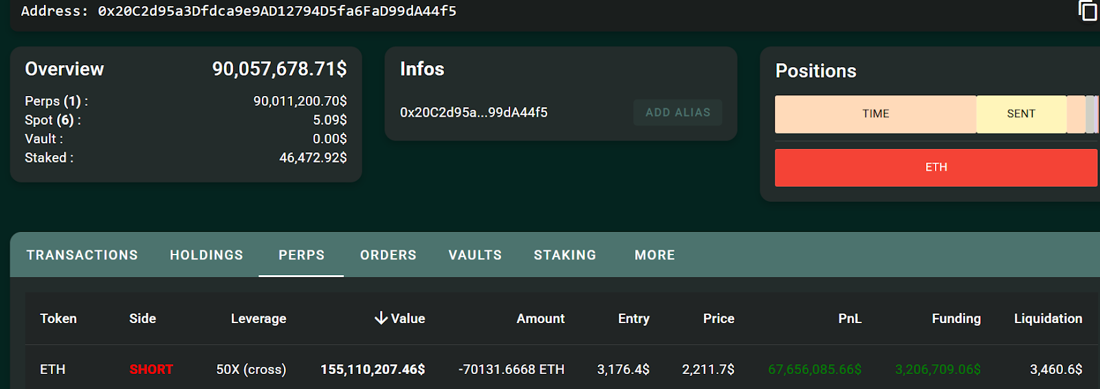 The trade involved shorting 70,131 ETH, worth more than $155 million at current prices. In addition to the unrealized gains, the trader also earned $3.2 million in funding fees. However, the position is at risk of liquidation if Ether’s price rises above $3,460.