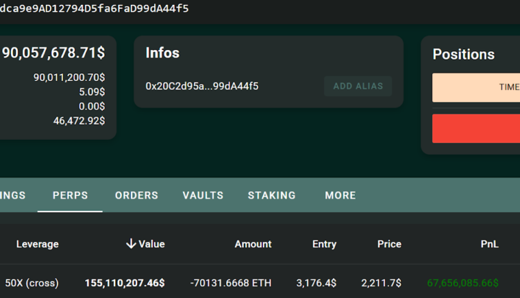 The trade involved shorting 70,131 ETH, worth more than $155 million at current prices. In addition to the unrealized gains, the trader also earned $3.2 million in funding fees. However, the position is at risk of liquidation if Ether’s price rises above $3,460.