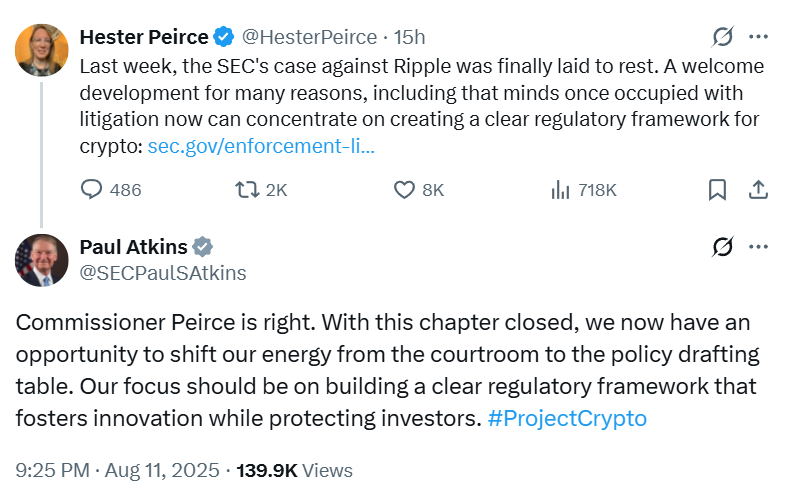 “With this chapter closed, we now have an opportunity to shift our energy from the courtroom to the policy drafting table,” said SEC Chair Paul Atkins in response to Peirce’s post. “Our focus should be on building a clear regulatory framework that fosters innovation while protecting investors,” he added.