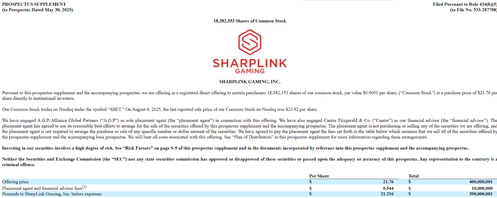 SharpLink has raised about $1.4 billion in gross proceeds to date from more than 71.5 million shares sold, the filing shows.