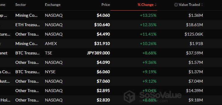 Crypto DAT stocks performed well on Tuesday. Source: SoSoValue