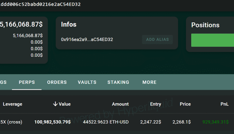 One whale (a large cryptocurrency investor) has opened an Ether (ETH) long position of over $101 million with 25x leverage at the entry price of $2,247, according to blockchain data from Hypurrscan.