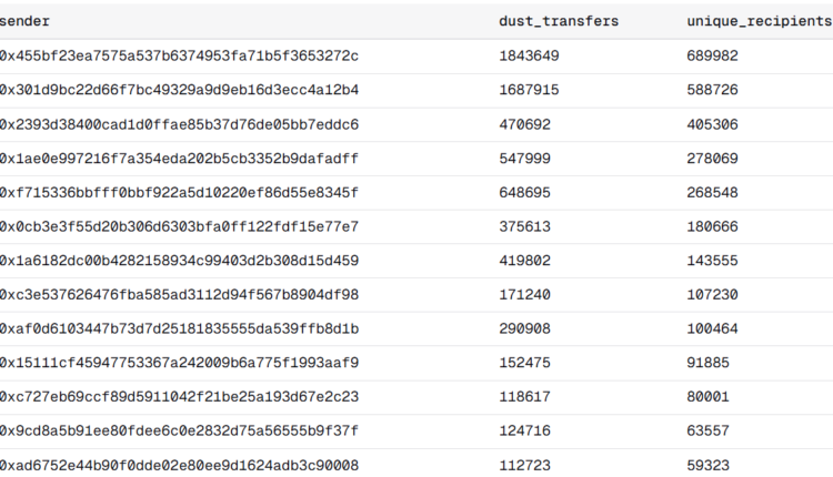 Top contract addresses distributing dust to bait addresses. Source: Andrey Sergeenkov