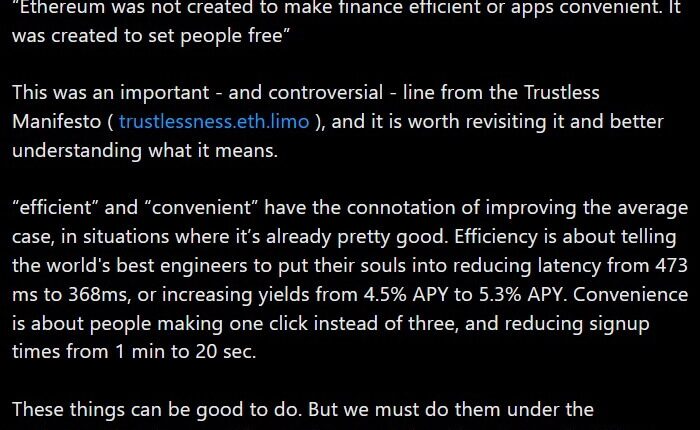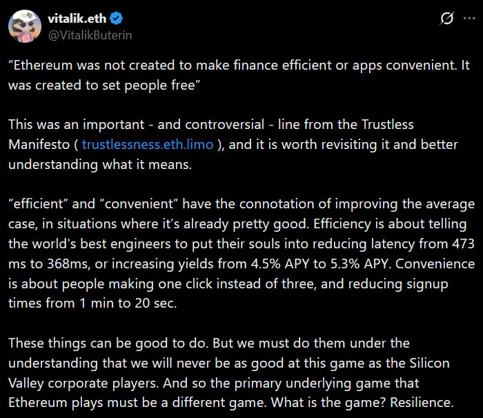 Buterin argued that Ethereum was not designed to optimize efficiency or convenience, but to ensure that users remain sovereign even under hostile conditions.
