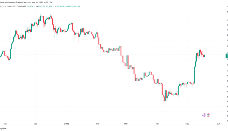 Ether’s (ETH) price was up on May 18, rising more than 2.5% over the last 24 hours to trade at $2,536. This recovery reinforces the optimism among traders that ETH price could hit $3,000 in May, citing strong technicals.