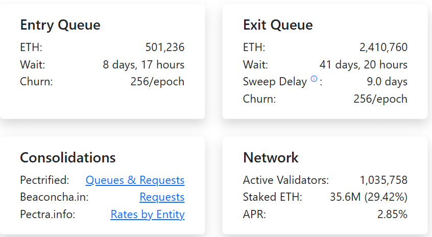 Ethereum’s exit queue surpassed 2.4 million Ether (ETH) worth over $10 billion on Wednesday. The spike in exits extended the validator queue time to more than 41 days and 21 hours, according to blockchain data from ValidatorQueue.com.