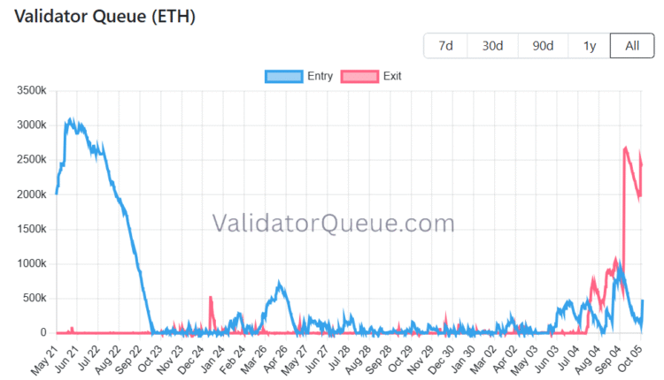 Ethereum’s exit queue surpassed 2.4 million Ether (ETH) worth over $10 billion on Wednesday. The spike in exits extended the validator queue time to more than 41 days and 21 hours, according to blockchain data from ValidatorQueue.com.