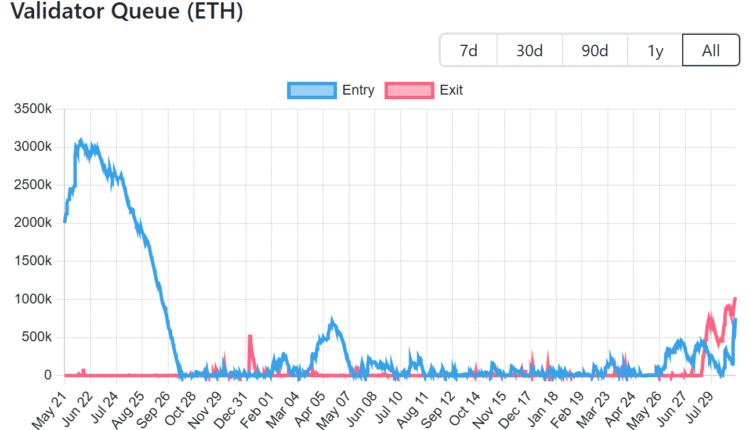 Ethereum is seeing the largest validator exodus in crypto history, with over 1 million Ether tokens currently waiting to be withdrawn from staking through Ethereum’s proof-of-stake (PoS) network.