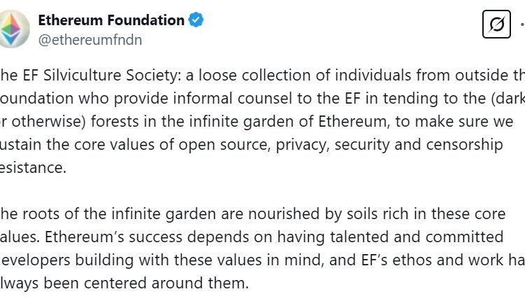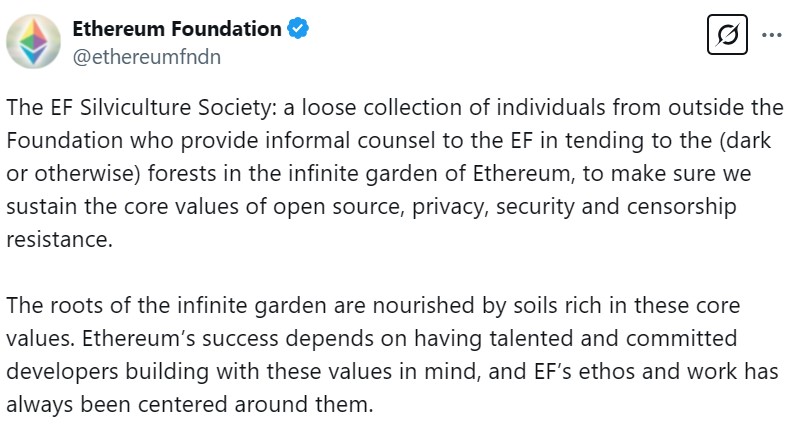 On Feb. 28, the foundation introduced the “Silviculture Society,” a collection of individuals from outside the EF. It said the group will provide informal counsel to the EF and tend “to the (dark or otherwise) forests in the infinite garden of Ethereum.”
