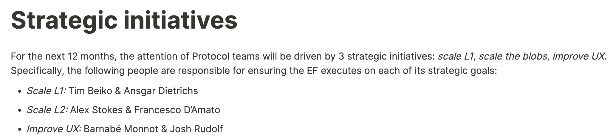 The revamp has affected the Foundation’s personnel. Longtime core developers such as Tim Beiko, Alex Stokes and Barnabé Monnot were formally assigned to each of the focus areas.
