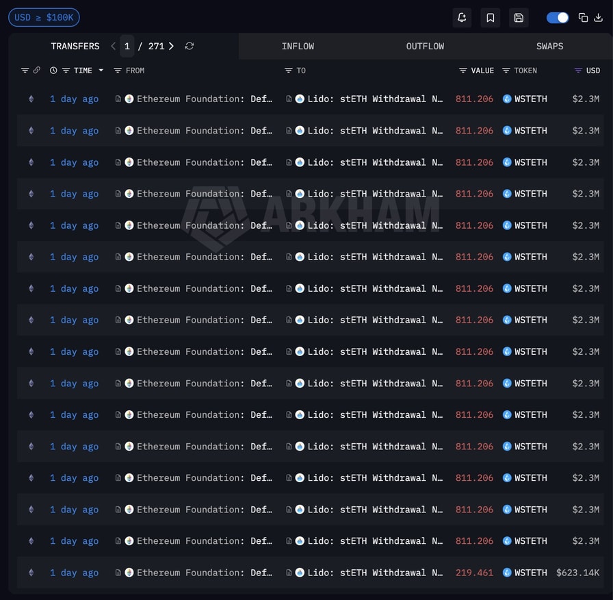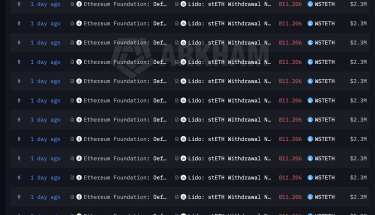 On Saturday, the Ethereum Foundation unstaked 17,035.326 ETH, worth roughly $40 million, according to Arkham data. The move involved depositing wrapped staked ETH (wstETH) into Lido’s unstETH contract, with ETH expected to be returned once the withdrawal queue completes.