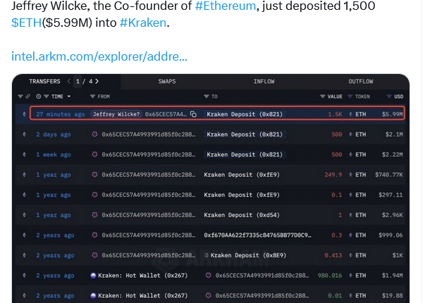 Ethereum co-founder Jeffrey Wilcke could be looking to sell some of his Ether holdings after sending around 1,500 ETH to crypto exchange Kraken on Thursday.