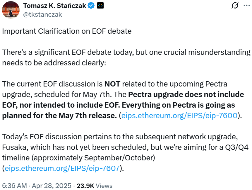 The comments come amid controversies over the upcoming implementation of the EVM object format (EOF) upgrade for the Ethereum Virtual Machine (EVM). As Stańczak pointed out, EOF is expected to be a part of the Fusaka network upgrade.