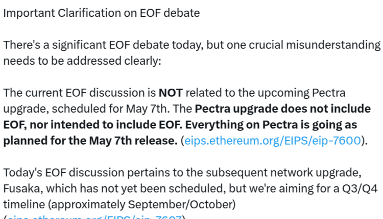 The comments come amid controversies over the upcoming implementation of the EVM object format (EOF) upgrade for the Ethereum Virtual Machine (EVM). As Stańczak pointed out, EOF is expected to be a part of the Fusaka network upgrade.