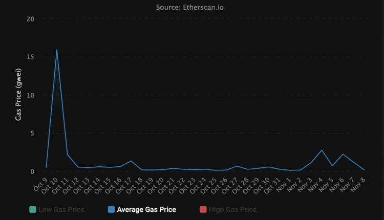 However, by October 12, fees dropped back down to just 0.5 Gwei and mostly remained well below 1 throughout October and November.