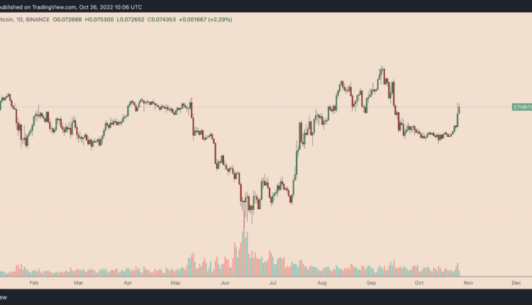The ETH/BTC pair gained around 8%, climbing as high as 0.075 BTC on Oct. 26.