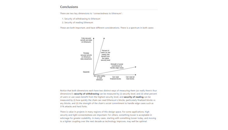 The Ethereum co-founder then delves into the trade-offs between different rollup solutions and systems that offer varying scaling capabilities to the ecosystem. The “connectedness” to Ethereum hinges on the security of withdrawing to Ethereum from L2s and the security of reading data from the Ethereum blockchain.
