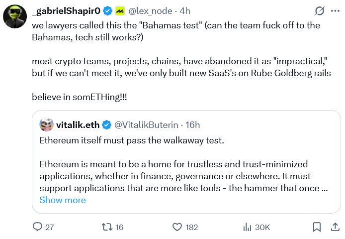 “We must get to a place where Ethereum’s value proposition does not strictly depend on any features that are not in the protocol already,” said Buterin in a post to X on Monday.