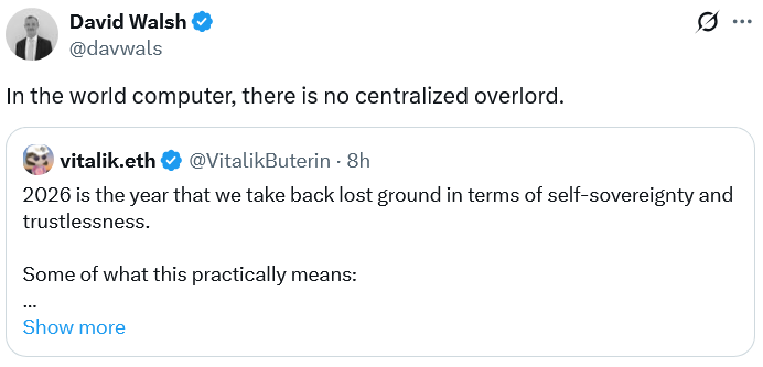 “2026 is the year that we take back lost ground in terms of self-sovereignty and trustlessness,” Buterin posted to X on Friday: