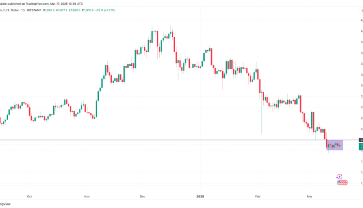 Ether’s (ETH) price has been consolidating within a roughly $130 range over the last seven days as $2,000 remains strong overhead resistance.