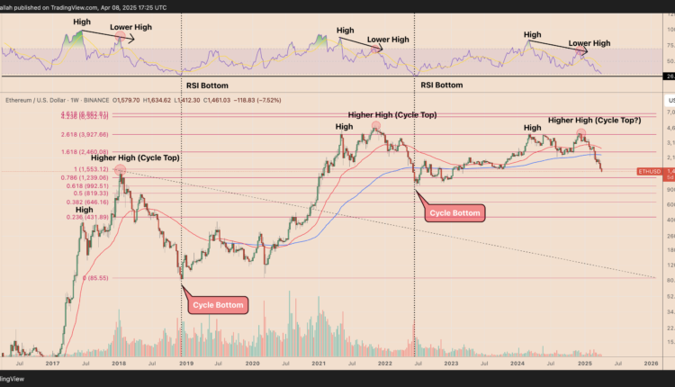 In December 2024, Ether formed a higher high near $4,095, while the RSI made a lower high—mirroring the bearish divergence seen in previous tops. This divergence marked the beginning of a sharp correction, much like the patterns seen in 2018 and 2022.