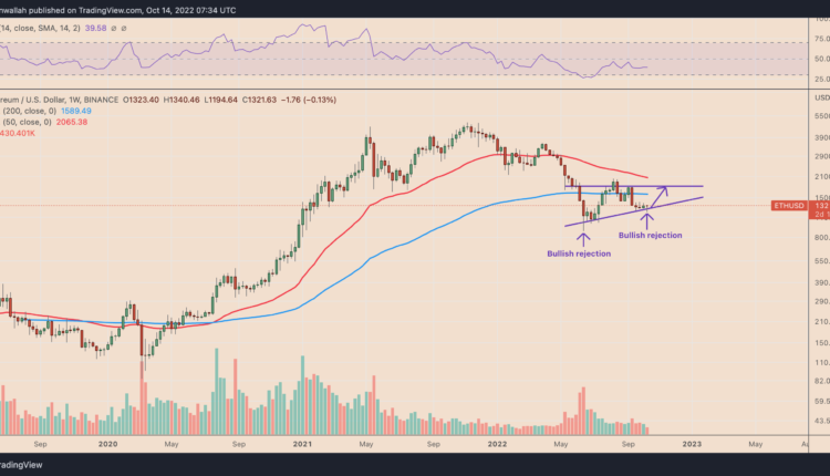 From a technical perspective, ETH’s price now eyes a 35% rebound by the end of October after holding testing a key support level. This level is a rising trendline that has capped Ether’s downside attempts since June 2022, as shown below.
