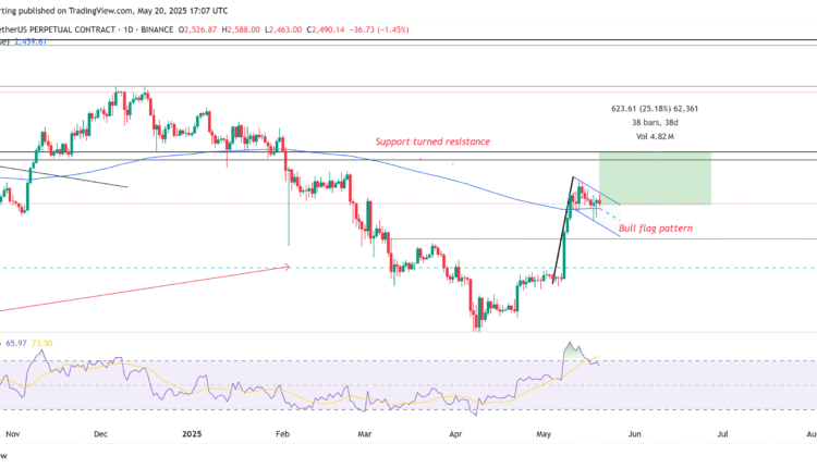 Ethereum (ETH) price is consolidating between $2,400 and $2,750 on its daily chart, forming a bull flag pattern with sights on the $3,000 to $3,100 resistance zone. A bull flag is a continuation pattern that follows a sharp rally (black flagpole) to $2,730 from $1,900, with the current range forming the flag.