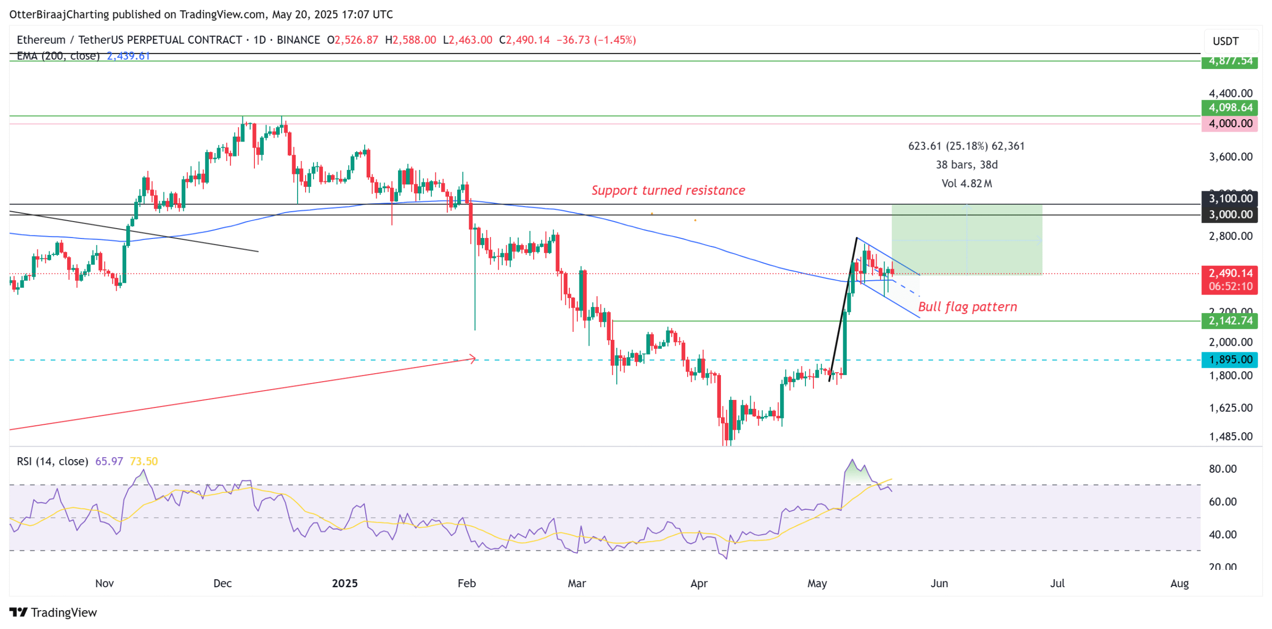 Ethereum is forming a bull flag on the daily chart, with a potential breakout above $3,600.