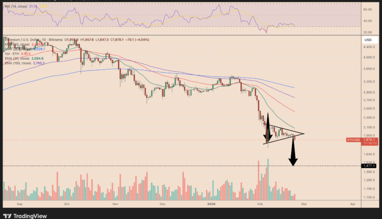 ETH bear pennant breakdown targets $1,475