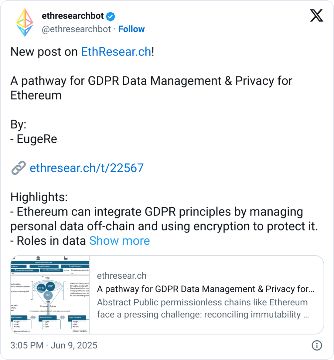 “By pushing personal data to the edges (wallets and DApps), using offchain storage with metadata-erasure, and splitting roles cryptographically, we can focus GDPR controller duties on a small set of entities, while the wider network becomes mere processors or falls out of scope,” Reggianini said.