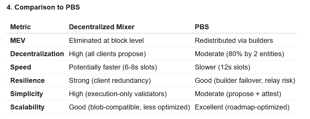 “This system flips that: block-building spreads to thousands of clients globally, fully democratizing the process. No single entity dominates—unlike PBS’s builder pool or a centralized mixer—and BFT mitigates mempool variance, ensuring robustness.”