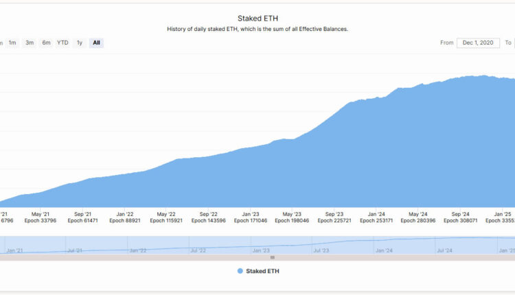 The amount of Ether (ETH) staked on the Beacon Chain reached a record high of 34.65 million ETH on Sunday, eclipsing the previous high on Nov. 10, 2024.